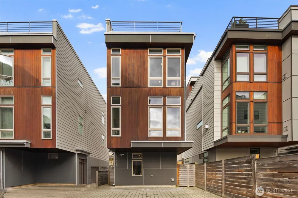 A stunning masterpiece in the heart of Ballard, this architecturally striking stand-alone home showcases cutting-edge design and impeccable craftsmanship. The open-concept layout is bathed in natural light, thanks to expansive walls of windows, while the sophisticated chef's kitchen features quartz countertops, premium stainless steel appliances, & elegant designer finishes. Floating stairs and custom steel railings add a dramatic touch, leading to the lavish top-floor primary suite, complete with a spa-inspired ensuite bath. Step onto the expansive rooftop deck and take in breathtaking panoramic views, perfect for entertaining or quiet relaxation. Minutes to downtown, shops, restaurants, parks and more. No HOA!