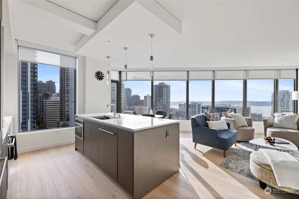 SELLER OFFERING 1% CREDIT . Your contemporary oasis in the highly desirable Spire condominiums! The beautifully appointed home on the 18th floor boasts modern finishes & an abundance of natural light, thanks to a stunning wall of windows that frame picturesque water, mountain & city views. Featuring light-colored hardwood floors & a luxurious kitchen w/high-end Bosch appliances, this place feels brand new as it has been lightly lived in. Enjoy the convenience of a spacious walk-in closet & the included automatic parking spot & upscale amenities. Walk to Seattle’s iconic Space Needle & vibrant neighborhoods filled w/restaurants, shops, entertainment & tech centers, this unit offers the perfect blend of urban living & serene views.