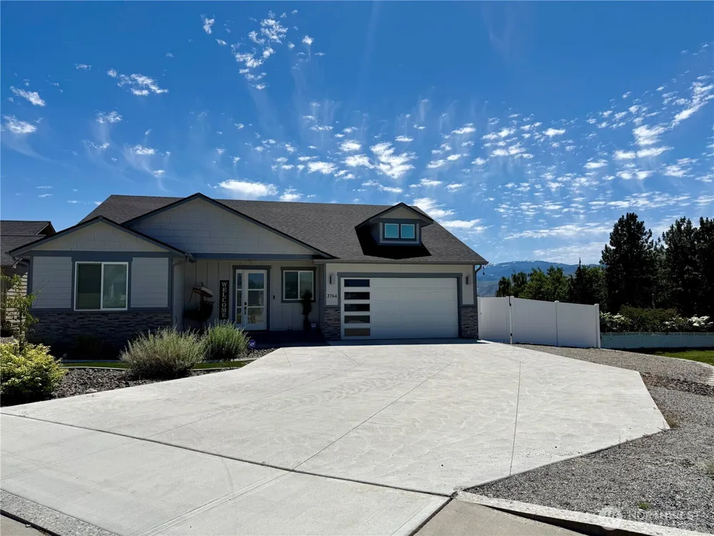River views abound in this near new 2020 home boasting expansive vaulted ceilings, one-level living tucked away in East Wenatchee, yet close to everything! Huge kitchen island lends the perfect gathering space for friends with custom countertops! Large primary bedroom has full 5-piece ensuite with soaking tub and luxury walk in shower! Two expansive bedrooms at the front of the home offer privacy and separation. All high-end appliances stay, plenty of parking for toys including RV parking and a huge double car garage. Outdoor entertainment awaits you on the covered outdoor stamped-concrete patio along with an outdoor firepit space and lots of grass, back yard has a new vinyl fence! Indoor/outdoor built-in surround sound system!