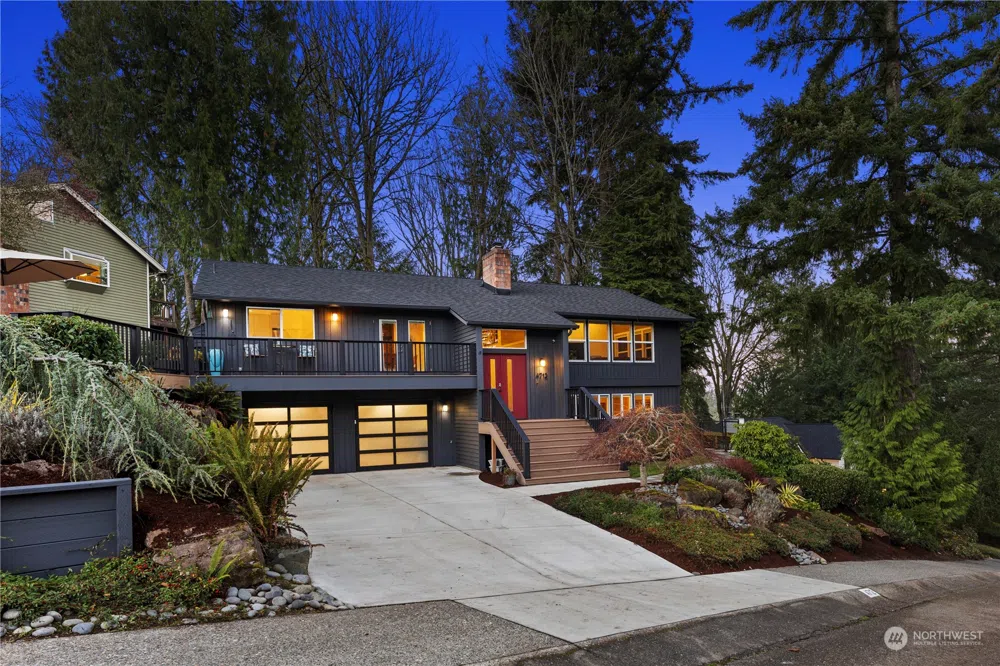 An exquisite 4 bedroom, 2.75 bath contemporary home located on a spacious, private lot that is adjacent to a wooded greenbelt. Recently remodeled this 2400 sf residence is turn key with views towards the Cascades. Open floor plan, vaulted ceilings & lots of windows. Gorgeous kitchen w/quartz counters, custom cabinets & top of the line GE Cafe apps. The primary suite is a luxurious retreat complete with soaking tub & large walk in shower. 2 cozy gas fireplaces. Air Conditioning. Hot Spring hot tub w/salt water. Durable, extra large deck w/lots of built in seating where you can soak in the morning & afternoon sun. Oversized 2 car garage. Fresh ext. & int. paint. Newer roof & gutters. Just minutes to Microsoft, Marymoor Park & Lake Sammamish.